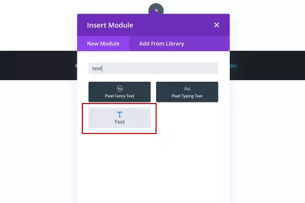 2. Once you have entered the Visual Builder, you have to add a Row to the page or click on the gray plus button inside an existing Row to add a new module. There you will see a list of modules. You can type “text” in the search bar and the Text module will appear on top. Click on it to add it.